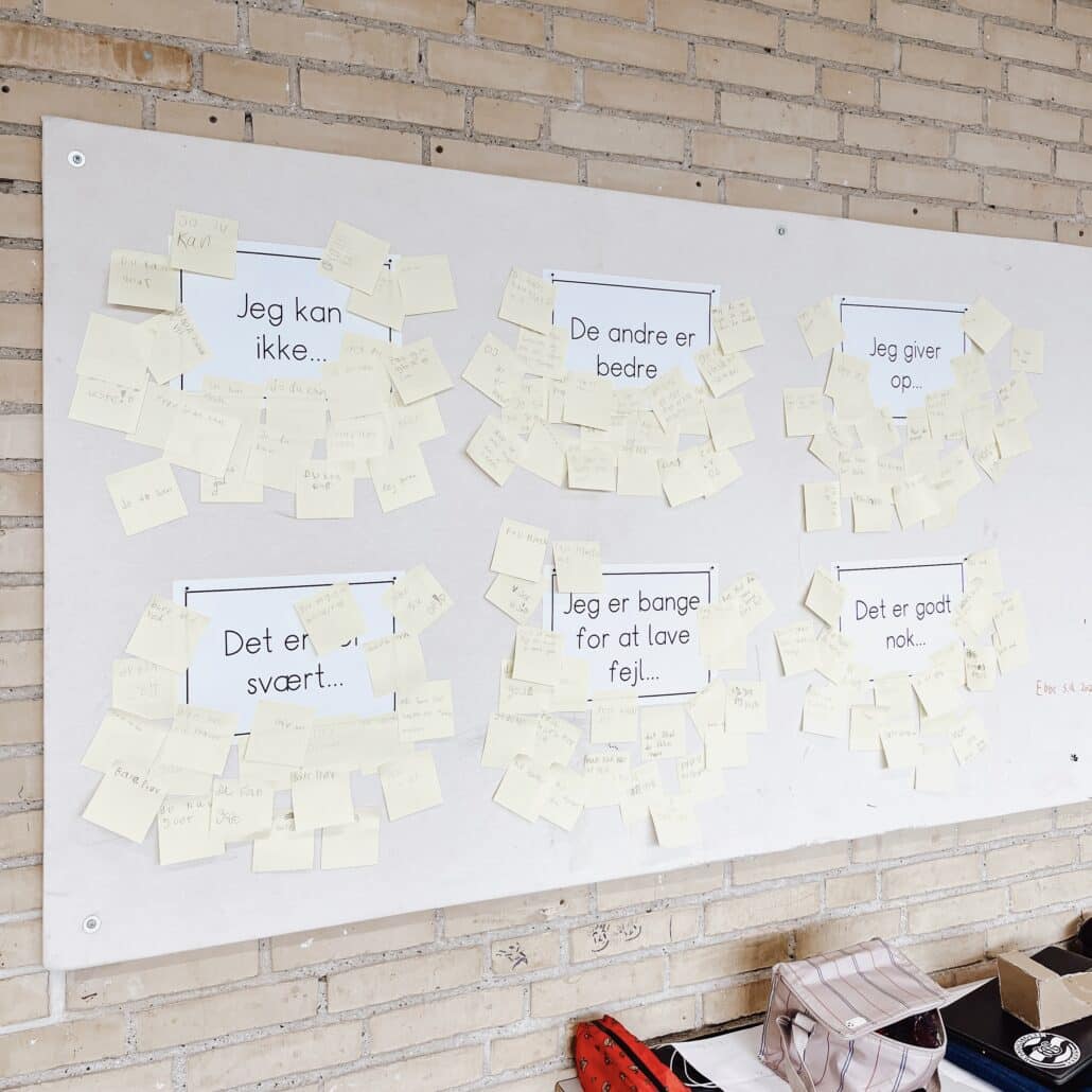 Vi hang forskellige tanker, som eleverne forbandt med et låst tankesæt op i klassen. Derefter bad vi dem forestille sig, at det var tanker som en klassekammerat gik med, og at det var deres opgave at hjælp dem over i et åbent tankesæt. De fik en post-it hver, hvorpå de omskrev tanken, så den kunne forbindes med et åbent tankesæt. Det var et bevidst valg, at vi bad dem hjælpe en klassekammerat og ikke sig selv. Vores erfaring er nemlig, at det for elever – og voksne – ofte er lettere at hjælpe andre end en selv.