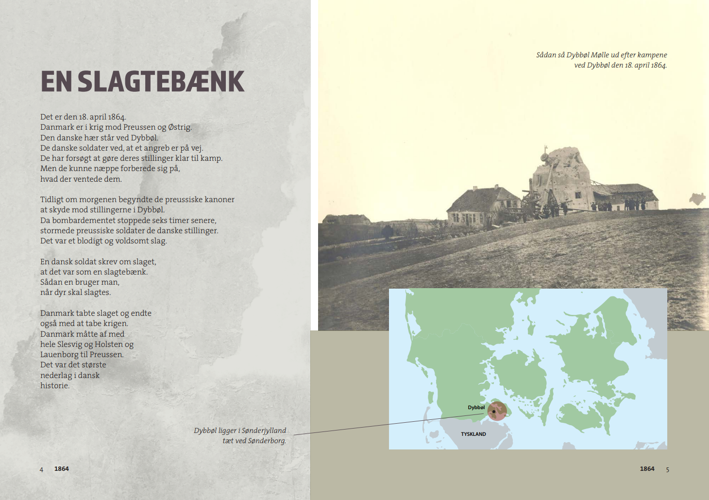 Det er den 18. april 1864. Danmark er i krig mod Preussen og Østrig. Ved Dybbøl står de danske soldater klar til kamp. Men de er oppe imod en stærkere fjende. Danmark taber både slaget ved Dybbøl og krigen i 1864. Næsten halvdelen af Danmarks befolkning og en tredjedel af alt land går tabt. Det var et kæmpe nederlag. I denne bog kan du læse mere om, hvorfor det gik galt i 1864.
