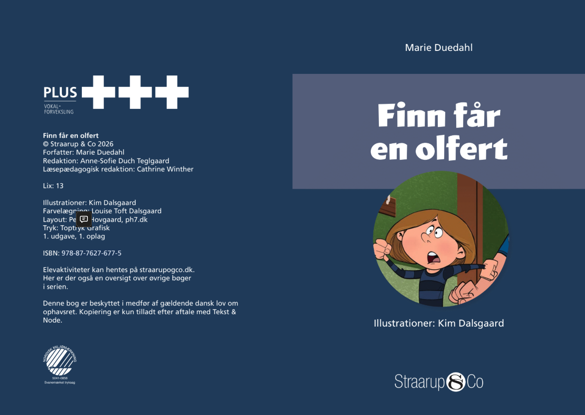 Finn får en olfert er skrevet af Marie Duedahl og er en Plus 3-bog, der har fokus på vokalforveksling.