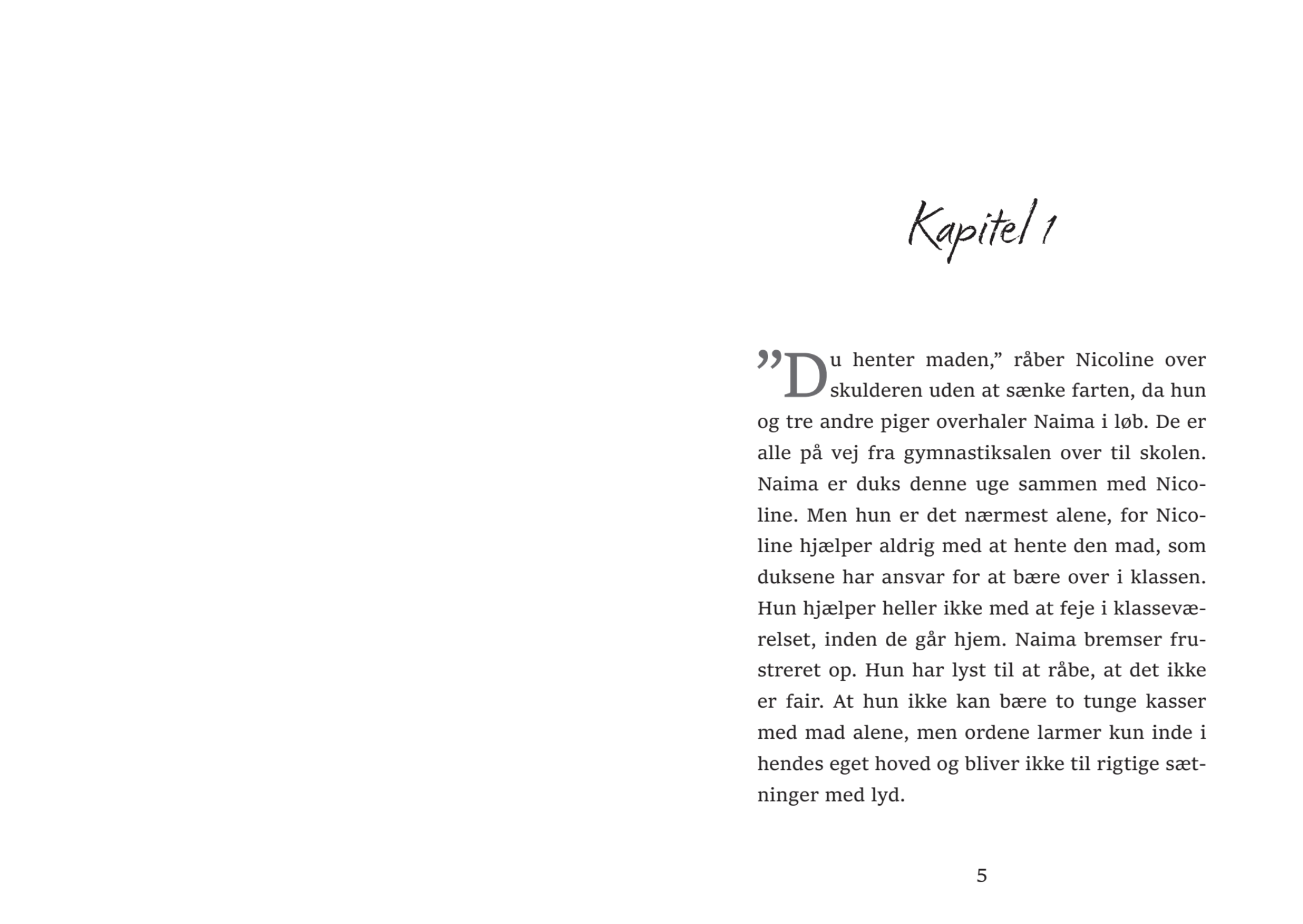 Naima er flygtet fra Syrien og bor nu med sin mor og storebror, ibrahim, i en lille vestjysk by. To af klassens piger presser Naima til at banke på hos en mystisk kvinde, der lever alene dybt inde i skoven. Rygterne siger, hun er en heks, men hvad er en heks, og findes de overhovedet? Inden længe er Naima atter på flugt, denne gang med en dyrebar last på ryggen.
