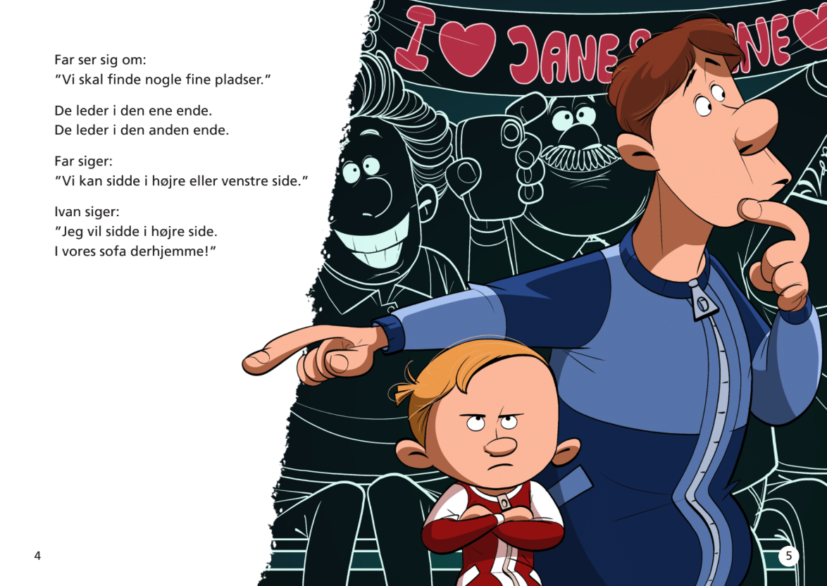 Ivan kan kun se rygge. Gid de fyre ville ryge og rejse! Deres skuldre er så brede! De er på bredde med en mur! Ivan kommer op på fars ryg. Er det mon en god idé?