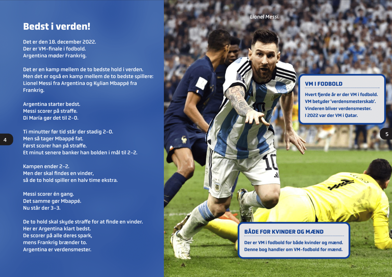 Hvem er bedst i verden? Denne bog er fyldt med historier om de bedste kampe og spillere. Du kan møde Pelé, Maradona, Zidane, Messi og Mbappé. Du kan også læse om, hvordan Danmark har klaret sig til VM.